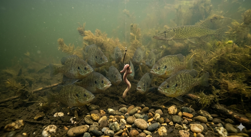 โ€ข Sunfish / Pumpkinseed โ€” common in shallower, vegetated areas.